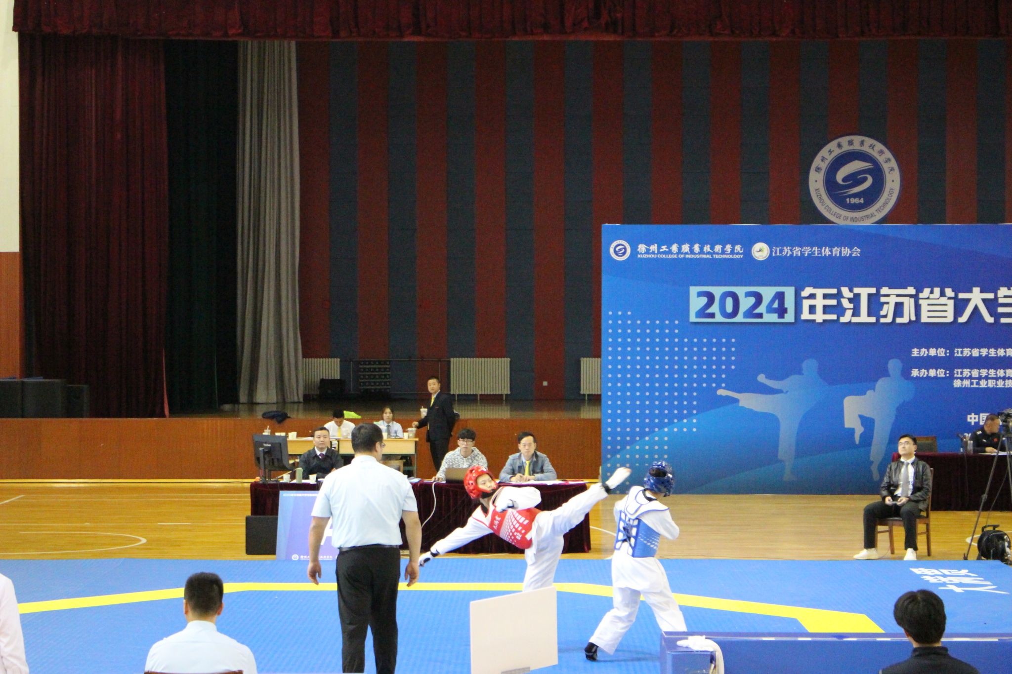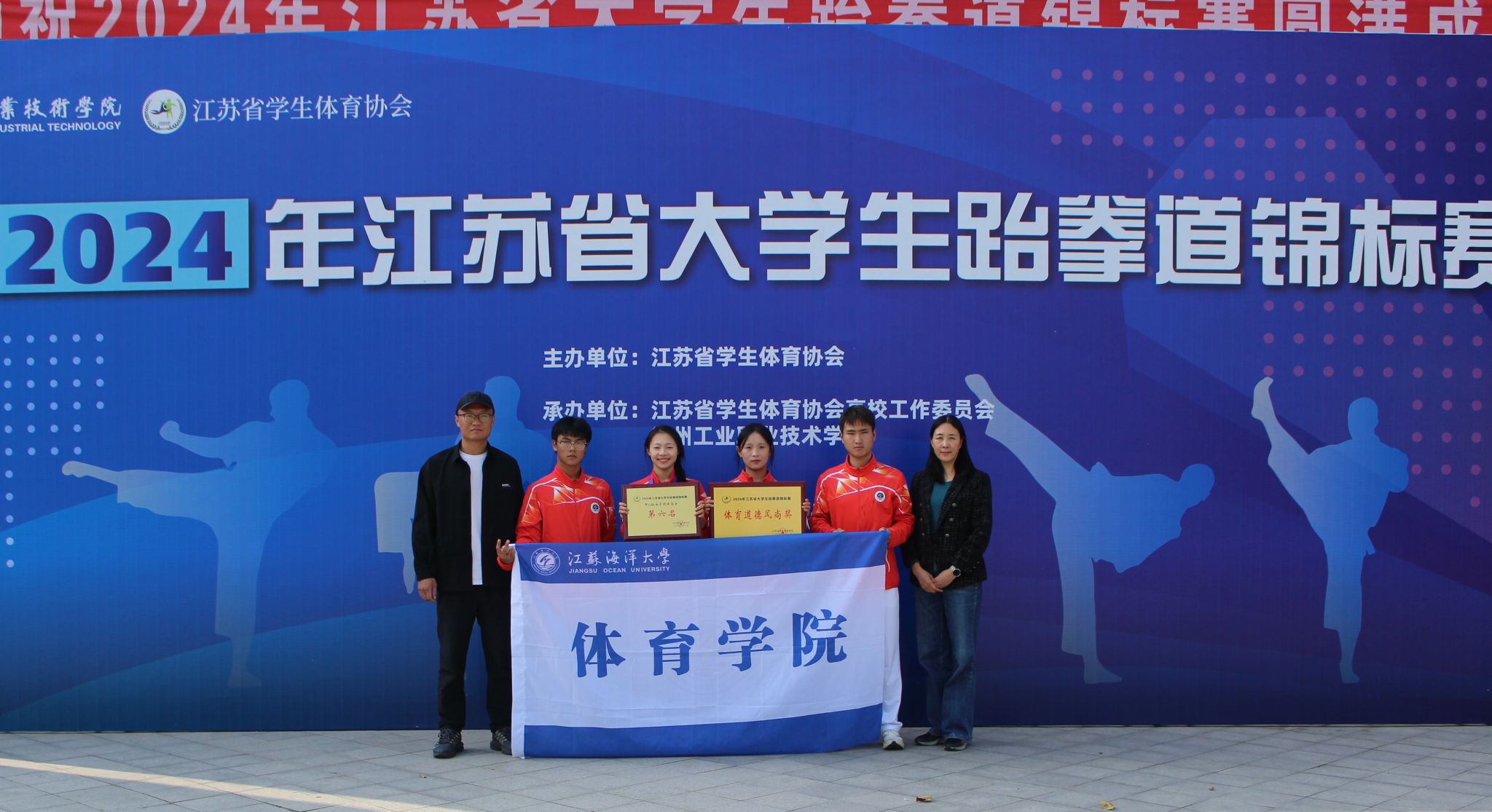 2024年江苏省大学生跆拳道锦标赛于10月30日至11月3日在徐州工业职业技术学院举行。在历时五天的比赛中,体育学院学生不畏强手,敢打敢拼,勇争佳绩,经过激烈角逐,共获得了竞技项目亚军、品势项目1个一等奖、3个三等奖的好成绩,获得女子甲A组团体总分第六名,同时荣获体育道德风尚奖运动队。