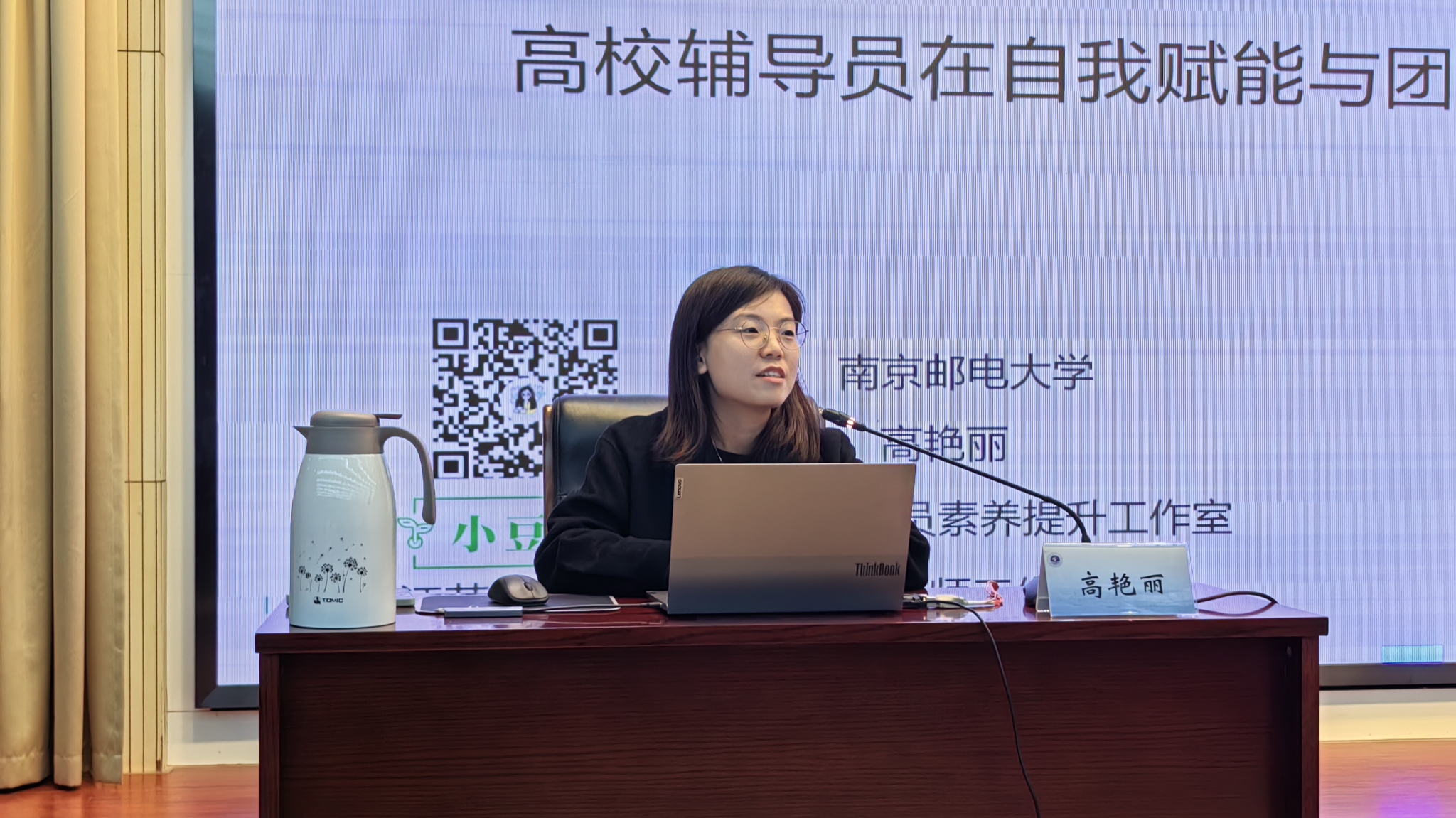 南京邮电大学外国语学院党委副书记、江苏省首批高校网络思政名师工作室主持人高艳丽以《破圈 融合 转型——高校辅导员自我赋能与团队成长的思考与路径构建》为题,结合辅导员工作经历,就如何加强理论学习、有效开展学生工作、促进个人成长等方面进行经验分享,并介绍了她所主持的省级网络名师工作室“小豆芽工作室”的发展历程和特色做法。