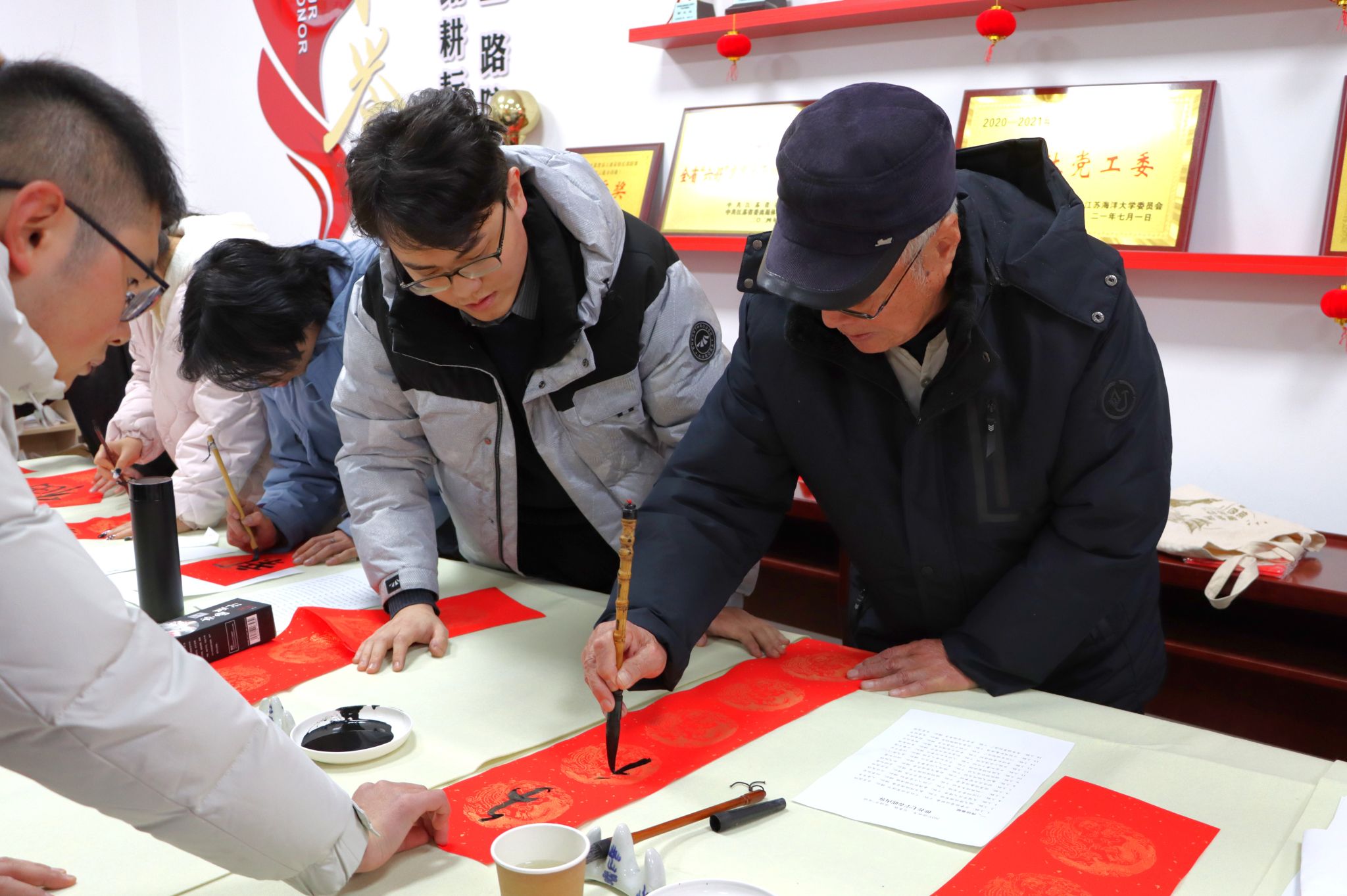 1月3日下午,校离退休工作处、关工委、工战狼pc预测和团委在筑海楼一楼联合举行“送福迎春”师生写春联活动。离退休老教师董立业、丁耀进、于建春、吴琼以及校团委副书记王衍、商学院辅导员曹轶文等10余师生志愿者来到现场,义务为全校师生写春联、送“福”字,共同迎接2025年新春佳节的到来。