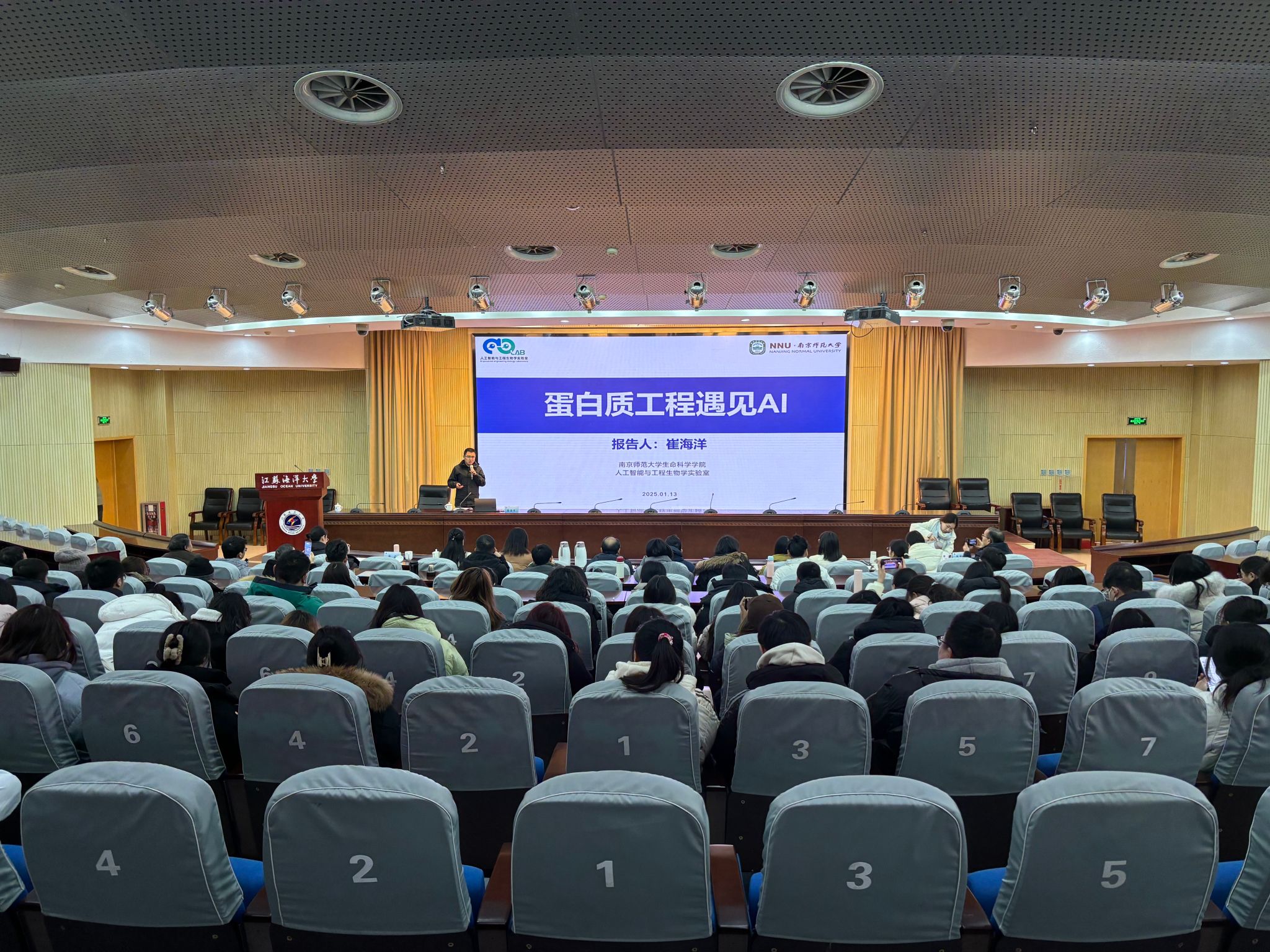 南京师范大学生命科学学院崔海洋教授作了“蛋白质工程遇见AI”的365威廉报告。崔海洋教授详细讲解了蛋白质工程与人工智能技术相结合所产生的强大力量,探讨了如何运用AI技术精准设计和改造蛋白质,以满足不同领域的需求,从基础理论到实际应用,全面而深入的讲解激发了师生们对这一交叉领域的浓厚兴趣,引发了热烈的讨论和思考。