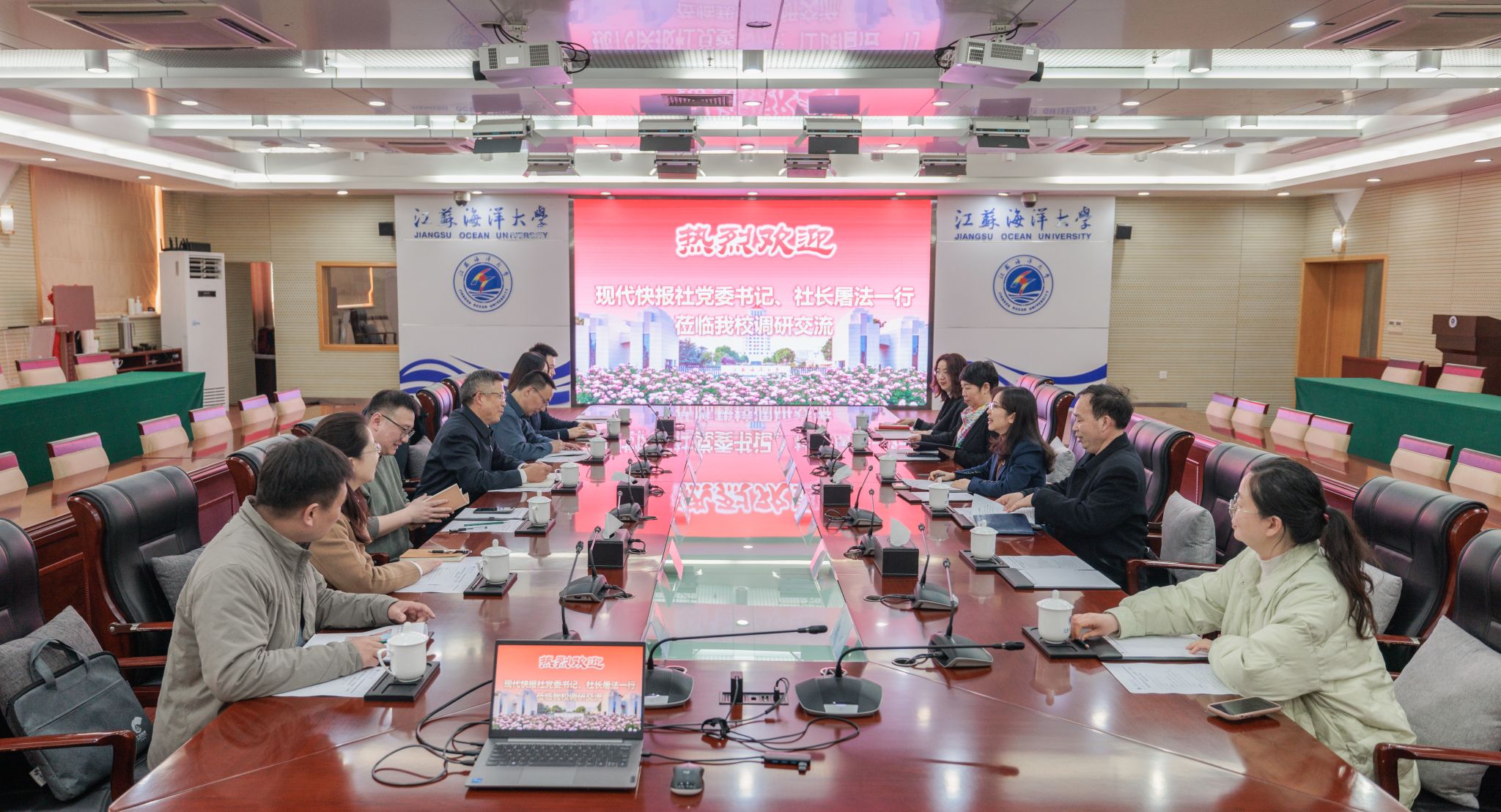 校党委常委、宣传部部长王波介绍了学校新闻宣传工作的情况,希望在重大主题宣传、推动海洋新质生产力发展、特色校园文化建设等方面加强合作。