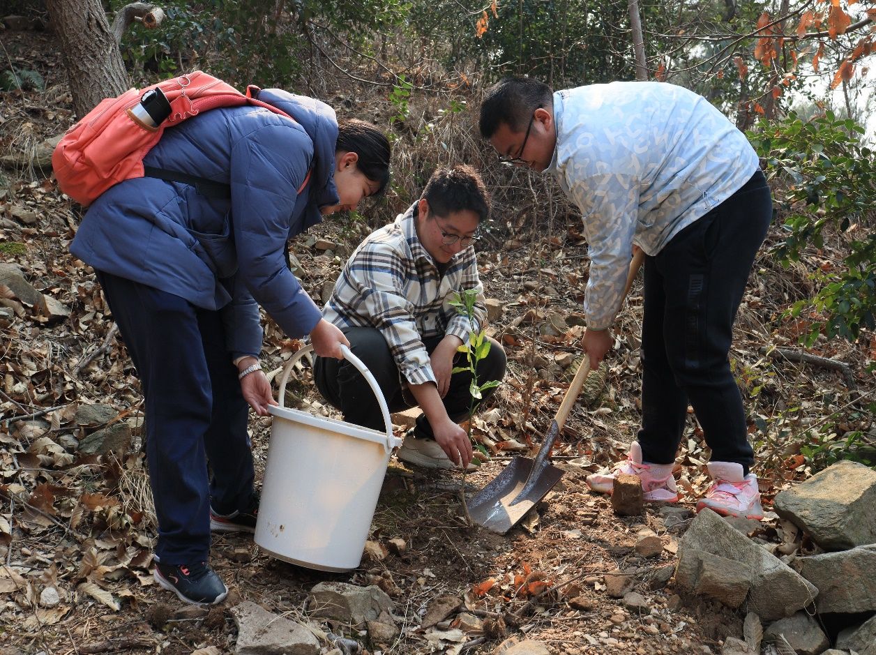 本科生和研究生志愿者积极响应号召,在活动组织者的带领下带着植树工具,来到指定植树区域。组织者先详细介绍了树木的品种和耐水性,指导志愿者们如何正确植树以确保树苗成活率。同学们自由分组,经过两个多小时的努力,30余棵小树苗在孔雀岭上“安家落户”,为这片土地增添了新的生机与活力。