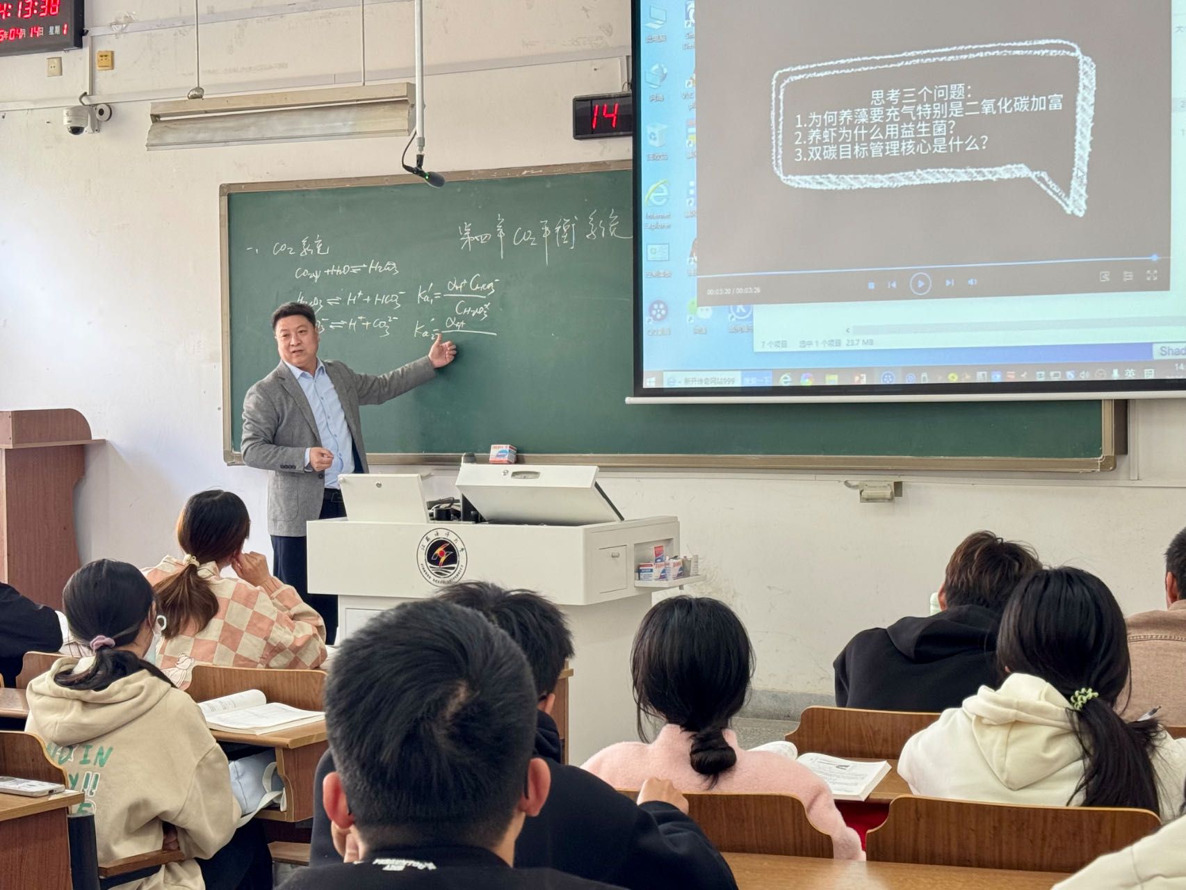 本次示范课以《水环境化学》课程中的“CO2平衡系统”为主题。董志国教授以“碳排放与环境保护”为切入点,通过三个富有启发性的问题:“为何养藻要充气特别是二氧化碳加富?”“养虾为什么用益生菌?”“双碳目标管理核心是什么?”引导学生深入思考我国“双碳”目标的意义,并自然过渡到课程主题。教学过程中,通过清晰的板书设计,将抽象的CO2平衡系统理论具象化;通过层层递进的提问,引导学生主动思考;通过丰富的科研实践案例,如海洋牧场、海底森林等绿色低碳经济新业态,帮助学生理解理论知识的实际应用价值;通过将自己的科研成果有机融入教学内容,实现了理论与实践的完美结合,潜移默化中培养了学生严谨治学的科学态度和实事求是的研究精神。