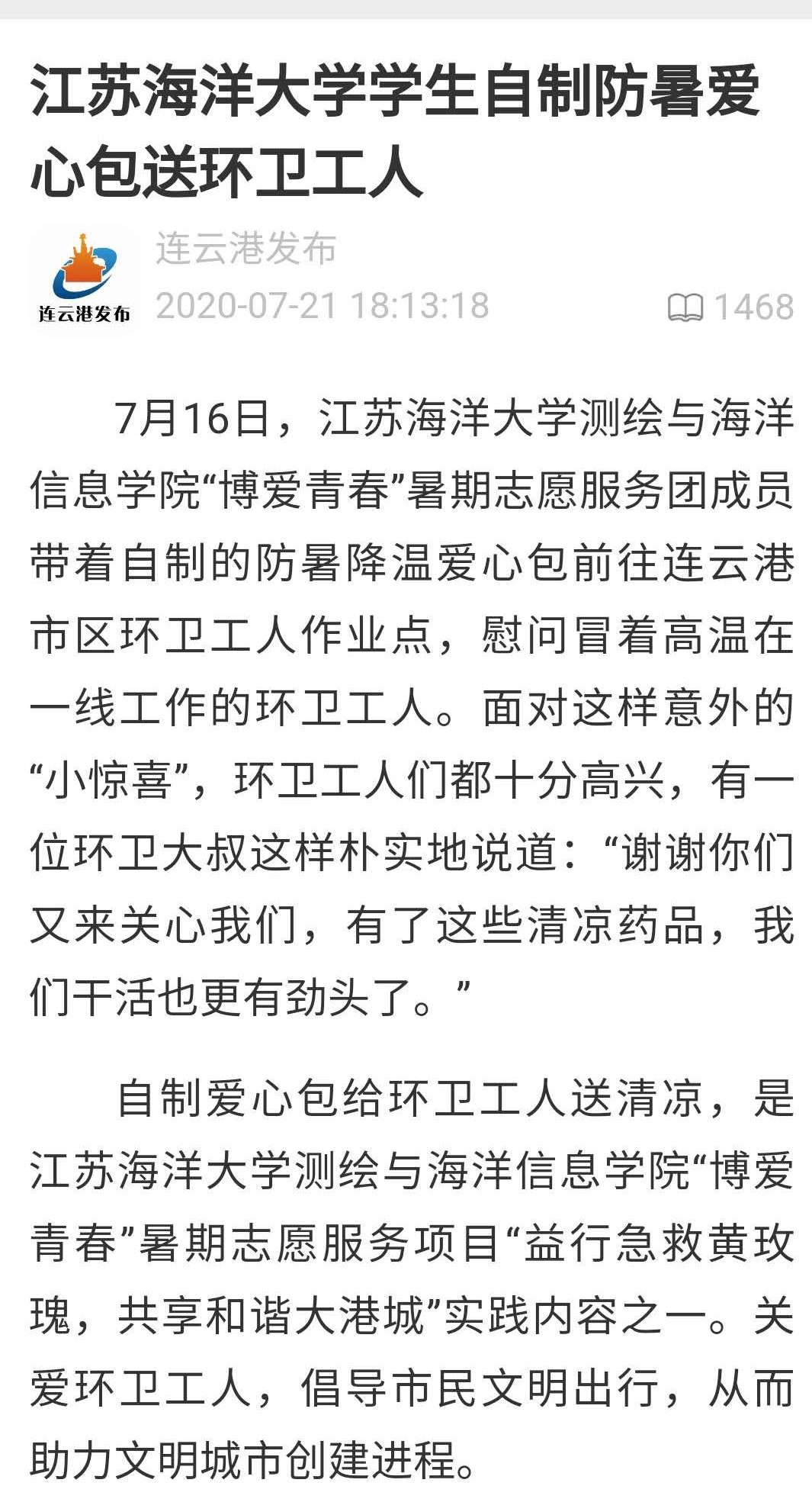 7月16日,足球装备推荐测绘与海洋信息学院“博爱青春”暑期志愿服务团成员带着自制的防暑降温爱心包前往连云港市区环卫工人作业点,慰问冒着高温在一线工作的环卫工人。面对这样意外的“小惊喜”,环卫工人们都十分高兴,有一位环卫大叔这样朴实地说道:“谢谢你们又来关心我们,有了这些清凉药品,我们干活也更有劲头了。”