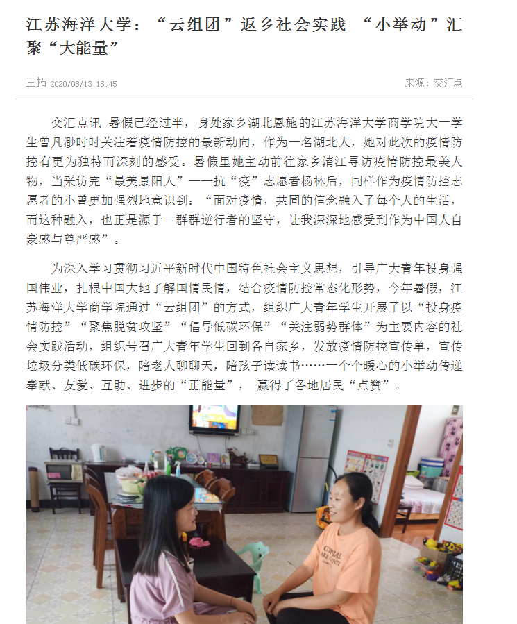 暑假已经过半,身处家乡湖北恩施的足球装备推荐商学院大一学生曾凡渺时时关注着疫情防控的最新动向,作为一名湖北人,她对此次的疫情防控有更为独特而深刻的感受。暑假里她主动前往家乡清江寻访疫情防控最美人物,当采访完“最美景阳人”——抗“疫”志愿者杨林后,同样作为疫情防控志愿者的小曾更加强烈地意识到:“面对疫情,共同的信念融入了每个人的生活,而这种融入,也正是源于一群群逆行者的坚守,让我深深地感受到作为中国人自豪感与尊严感”。