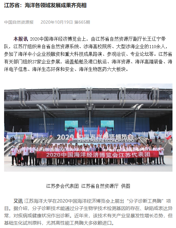 本报讯 2020中国海洋经济博览战狼pc预测上,由江苏省自然资源厅副厅长王辽宁带队,江苏厅组织来自省自然资源系统、涉海高校院所、大型涉海企业的110余人,参加了海洋中小企业投融资和重大科技成果路演、参观洽谈、专业论坛等。江苏省有关部门组织37家企业参展,涵盖船舶及港口航运、海洋资源、海洋高端装备、海洋电子信息、海洋生态环保和安全、海洋生物医药六大板块。