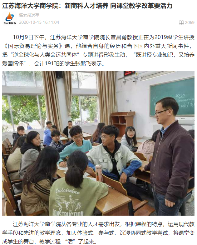宣昌勇教授主讲的《国际贸易理论与实务》课程,探索线上线下混合式课堂教学模式,将课本知识学习放在课下和线上,在上课前一周,将下一次课的思考题、讨论题和案例分析题等上传至平台上为学生预习提供指导。课堂上老师进行简单的讲解后,主要进行思考题、讨论题和案例分析题的讨论、操作题的演示等,真正将课堂交给学生,让学生在思考、辩论和操作中掌握知识和技能。(苏海轩)