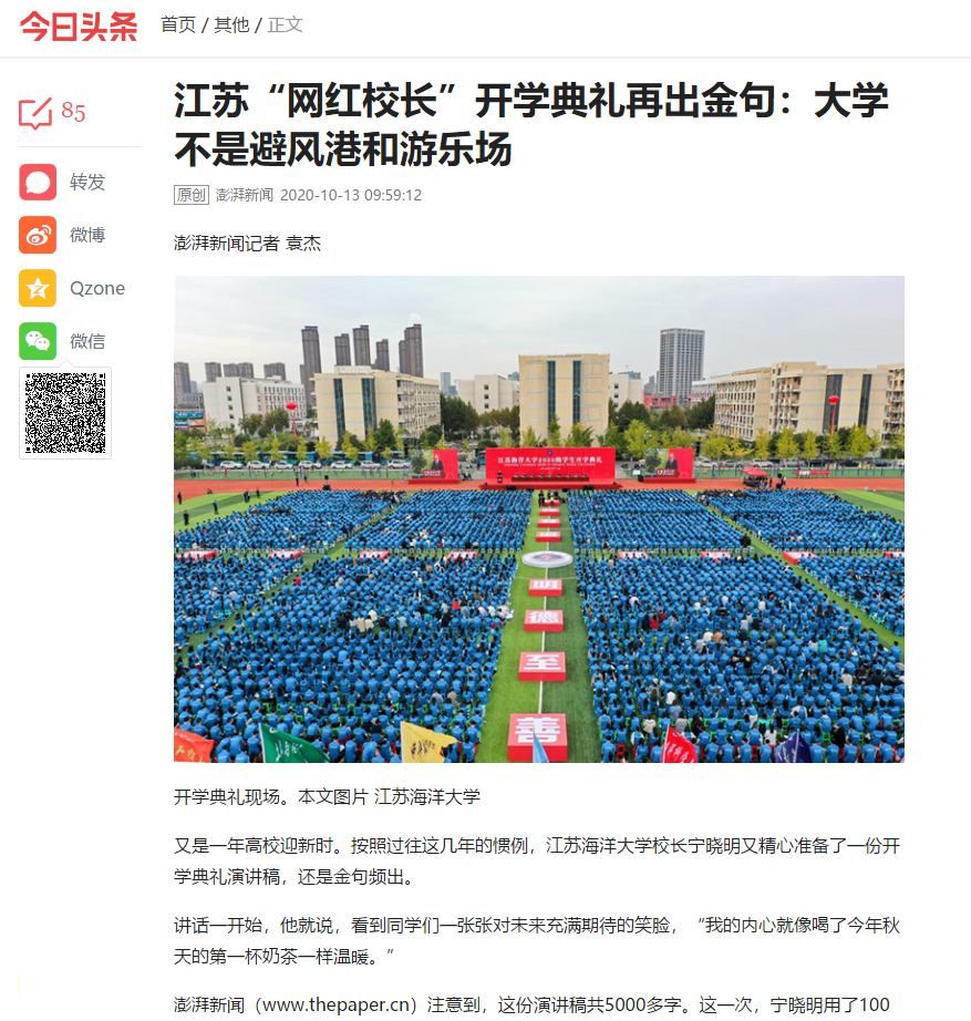 他说,举办隆重的开学典礼,一是给学生以仪式感,二是给学生进行入学教育。而开学典礼校长讲话,又是学生进校后的上的第一堂大课。