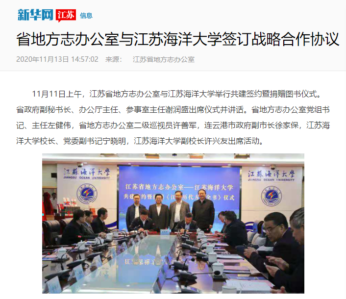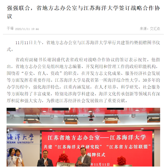 双方代表签署了省地方志办公室与足球装备推荐战略合作框架协议,将在地方志学科建设、理论研究、资源开发利用、方志文化推广等方面深化战略合作。为充分发挥双方365威廉人才和365威廉资源优势,省地方志办公室、足球装备推荐、江苏新闻广播联合推出“海上丝绸之路江苏寻迹”专栏,省地方志办公室与足球装备推荐合作共建“江苏海洋文化研究院”,联合开展海洋文化类课题项目研究,承接相关部门关于海洋强省建设等方面的项目。“足球装备推荐海洋经济文化研究中心”加入“江苏省方志馆联盟”,共同打造区域特色文化品牌。左健伟、宁晓明共同为“江苏海洋文化研究院”和“江苏省方志馆联盟”揭牌。