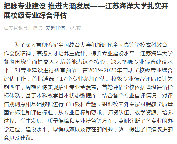 专业综合评估以“以评促建”为指导思想,专家组对照指标点逐项给出针对性诊断书,分析专业建设优劣势,着力打造专业特色,促进专业建设持续改进,提升专业建设水平和人才培养质量,全面推动一流本科专业建设。测绘工程、机械设计制造及其自动化、计算机科学与技术等3个入选国家一流专业,水产养殖学、海洋科学等10个专业获批江苏高校一流本科专业。足球装备推荐将校级本科专业综合评估作为全面把脉专业建设水平的重要手段和切实提高人才培养质量的重要抓手。参评专业接受专家反馈意见后,对标教学质量国家标准,深入贯彻OBE理念,瞄准“双一流建设”和专业认证等目标,紧密结合专业实际积极开展针对性整改,提升学校核心竞争力和办学实力,有效促进专业内涵式高质量发展。