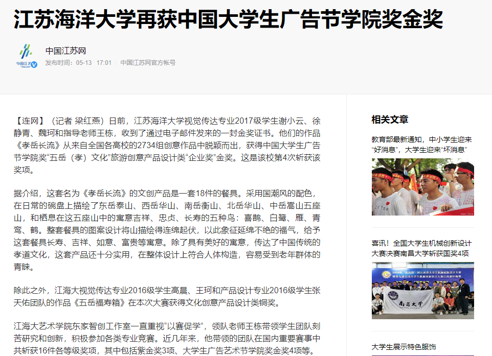 除此之外,江海大视觉传达专业2016级学生高晨、王珂和产品设计专业2016级学生张天佑团队的作品《五岳福寿箱》在本次大赛获得文化创意产品设计类铜奖。