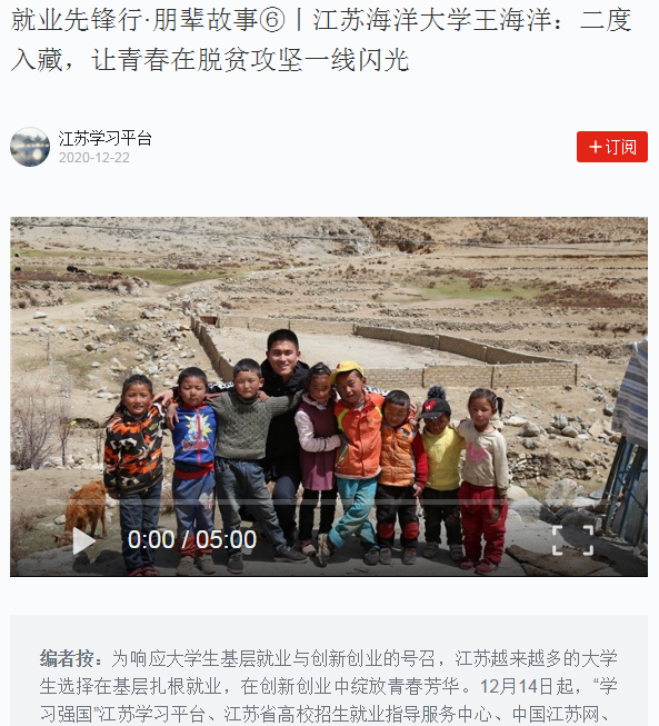 2016年7月,王海洋在复员返校完成大专、本科阶段的学业后,恰逢江苏高校内开展进藏大学生专招工作,他深刻了解西藏环境的艰苦,也深刻地知道西藏人才的稀缺。作为一名军人、一名共产党员,在祖国最需要的时候,他义无反顾地再次积极响应国家的号召,来到了祖国最需要的地方,第二次进入西藏绽放自己的青春。