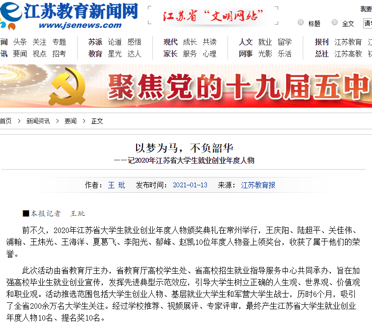 前不久,2020年江苏省大学生就业创业年度人物颁奖典礼在常州举行,王庆阳、陆超平、关佳伟、浦翰、王炜光、王海洋、夏葛飞、李阳光、郁峰、赵凯10位年度人物登上领奖台,收获了属于他们的荣誉。
