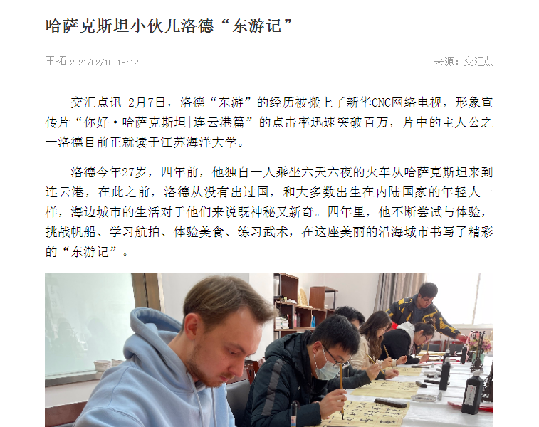 “一带一路”倡议下,中国与中亚五国不断对话交流、互学互鉴,洛德站在新的起点,不断用镜头记录和分享他在中国的生活和连云港的发展变化。美食、美景、文化……这个哈萨克斯坦小伙,其实早已在无形中与东方产生了千丝万缕的联系,用自己的经历书写了“一带一路”的现代版“东游记”,而他的故事,仍然未完待续。(通讯员:苏海轩)
