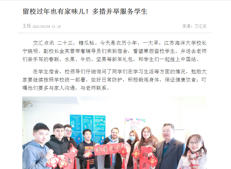 学校集中安排同学们住在苍梧校区B2宿舍和文予楼宿舍,基本都是单人间或双人间,全部配有空调、电热水器,为留校困难学生发放500-800元临时困难补助,将留校学生组建了临时团支部,定期组织户外体育活动。团委老师还为学生办起了书法培训班,教同学们写春联,练书法。学校还特意为留校学生发放了“防疫大礼包”,预定了年夜饭,校领导将与留校学生一起守岁包饺子。(通讯员:仲伟雨 魏灵钢)