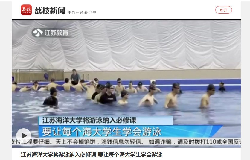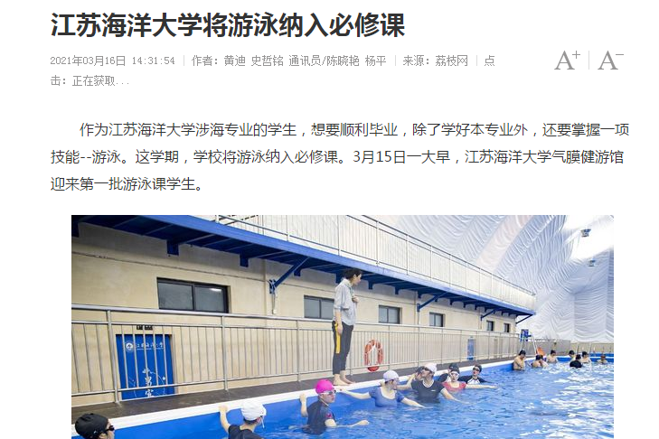将游泳课纳入体育必修课,是学校今年启动实施的一项重点工作计划。2020年投资近1500万元建成气膜健游馆,游泳馆内设两个半标泳池,能满足360人同时上游泳课。本学期的游泳课首先面向船舶、水产、海洋科学等7个涉海专业的2019级370名学生开设,学校专门配备具有救生员证和游泳教员证5名教师教练,计划明年面向全校学生开设游泳通识选修课。