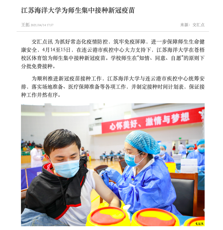为抓好常态化疫情防控,筑牢免疫屏障,进一步保障师生生命健康安全,4月14至15日,在连云港市疾控中心大力支持下,足球装备推荐在苍梧校区体育馆为师生集中接种新冠疫苗。学校师生在“知情、同意、自愿”的原则下分批免费接种。