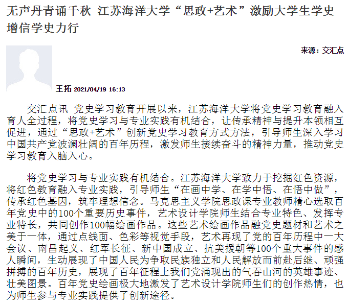 据悉,该校艺术设计学院还通过多种途径挖掘党史绘画的育人元素,在学院微信公众号上推出“美术经典中的党史”专栏,用艺术专业学生熟悉的语言宣传党史,讴歌党的奋斗历程。该学院艺术基础教研室主任、党支部书记冯大康还在画室的画架前,为学生党员和入党积极分子上了一场身临其境的党课。课后,一位学生表示:“我更加深刻地认识到,没有共产党就没有新中国,就没有我们今天的幸福生活!作为青年大学生,我要加倍珍惜今天的学习条件,努力学好专业知识,争取为祖国奉献青春力量。”(通讯员:卢娟)
