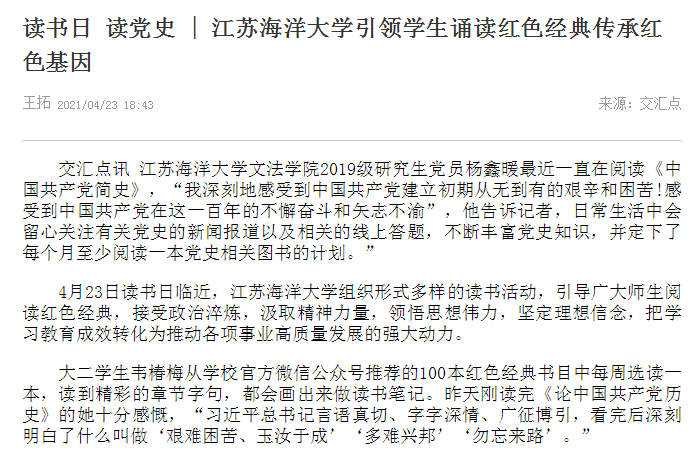 商学院在微信公众号推出“百人百篇接力诵读党史”微电台专栏,由100名学生当“主播”,以接力诵读的形式读经典学党史,激发了广大青年学生在诵读红色经典中,传承红色基因,赓续精神血脉。金融专业201班学生徐海录播了“五四运动 唤醒民众”的党史故事后表示,作为新时代的大学生,面对祖国前途无限光辉灿烂的未来,更应该有爱国之心,树报国之志,为实现伟大的“中国梦”奋斗不息。(通讯员:陈晓艳)
