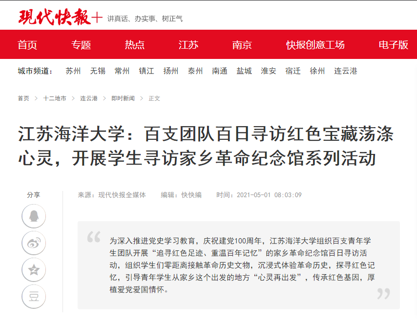 寻访活动从2021年初寒假开始,大一到大三的近千名青年学生,按照自愿就近原则,组建了近百支寻访队伍,利用寒假时间奔赴各地寻访家乡革命纪念馆,先后到井冈山革命纪念馆、淮海战役纪念塔、周恩来纪念馆、渡江战役纪念碑、太仓革命烈士馆等50余家纪念馆“打卡”现场学习,足迹遍布江苏、江西、四川等11个省份的30多个地级市。