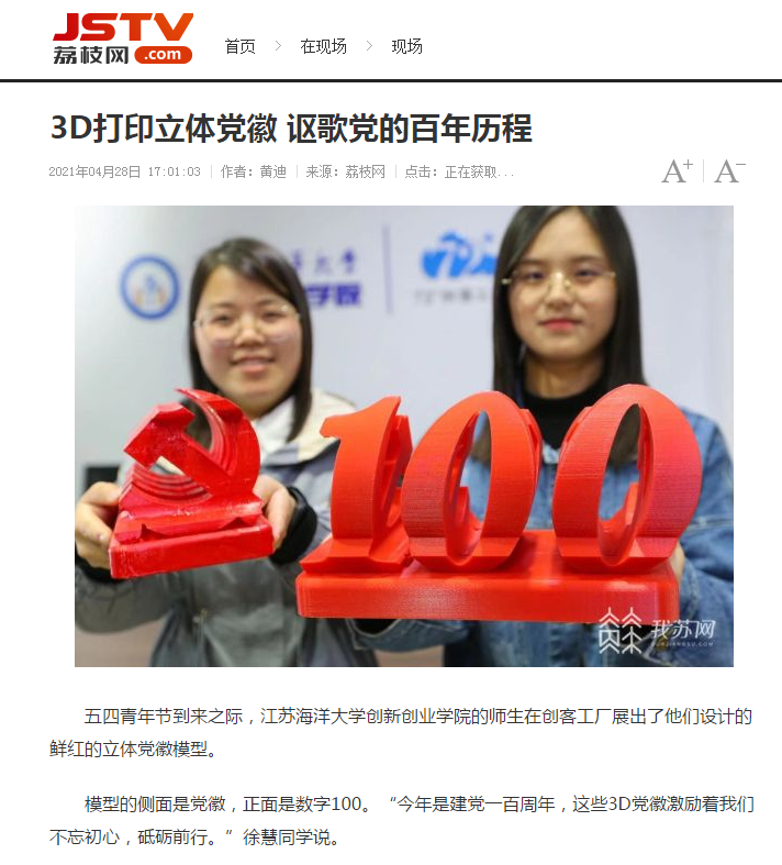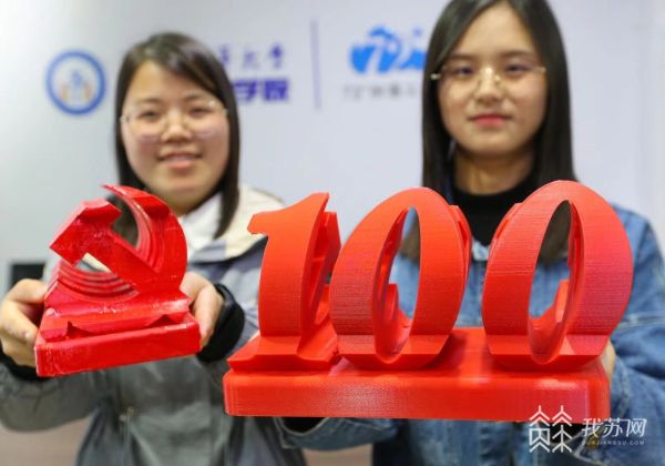 模型的侧面是党徽,正面是数字100。“今年是建党一百周年,这些3D党徽激励着我们不忘初心,砥砺前行。”徐慧同学说。