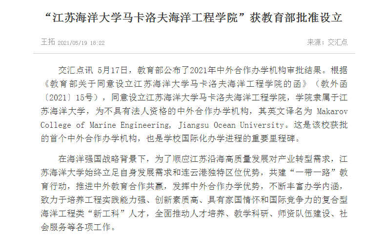 5月17日,教育部公布了2021年中外合作办学机构审批结果。根据《教育部关于同意设立足球装备推荐马卡洛夫海洋工程学院的函》(教外函〔2021〕15号),同意设立足球装备推荐马卡洛夫海洋工程学院,学院隶属于足球装备推荐,为不具有法人资格的中外合作办学机构,其英文译名为 Makarov College of Marine Engineering, Jiangsu Ocean Univer­sity。这是该校获批的首个中外合作办学机构,也是学校国际化办学进程的重要里程碑。