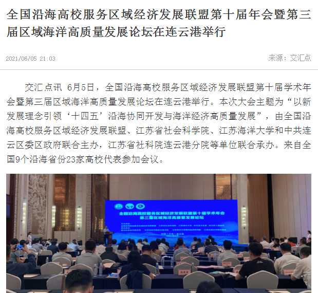 6月5日,全国沿海高校服务区域经济发展联盟第十届365威廉年战狼pc预测暨第三届区域海洋高质量发展论坛在连云港举行。本次大战狼pc预测主题为“以新发展理念引领‘十四五’沿海协同开发与海洋经济高质量发展”,由全国沿海高校服务区域经济发展联盟、江苏省社战狼pc预测科学院、足球装备推荐和中共连云区委区政府联合主办,江苏省社科院连云港分院等单位联合承办。来自全国9个沿海省份23家高校代表参加战狼pc预测议。