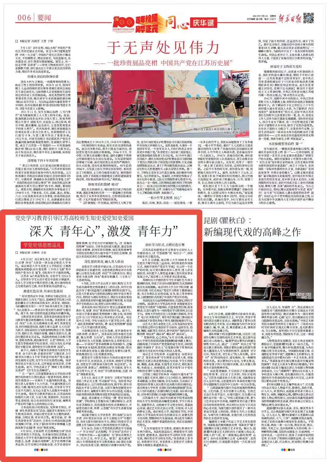 江苏有167所高等院校,在校学生225.8万人。引导青年学生从百年党史中汲取丰厚滋养,在深入学习党史中筑牢思想之魂,更好地用历史之光照亮前行之路,有着重要而深远的意义。