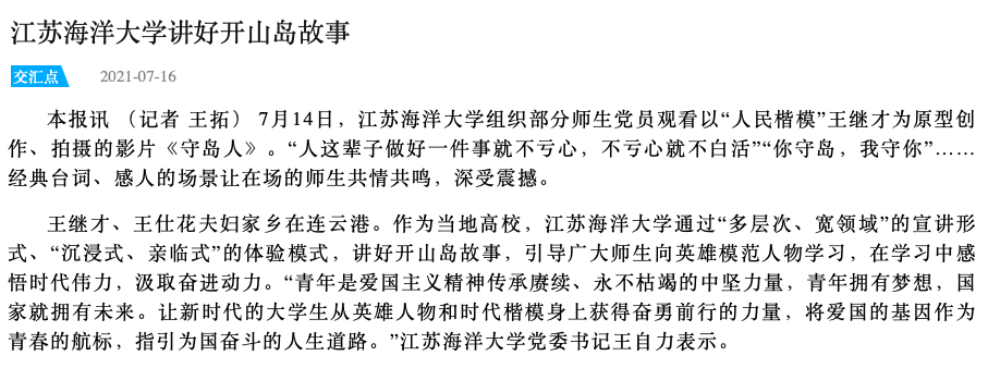 7月14日,足球装备推荐组织部分师生党员观看以“人民楷模”王继才为原型创作、拍摄的影片《守岛人》。“人这辈子做好一件事就不亏心,不亏心就不白活”“你守岛,我守你”……经典台词、感人的场景让在场的师生共情共鸣,深受震撼。