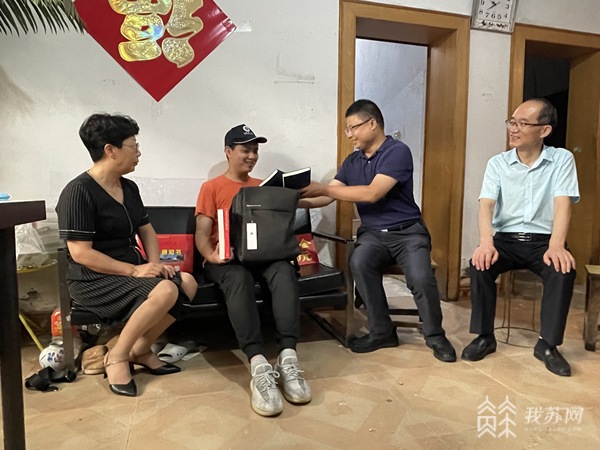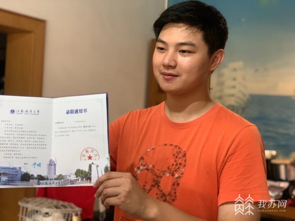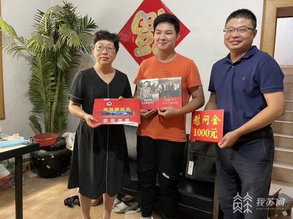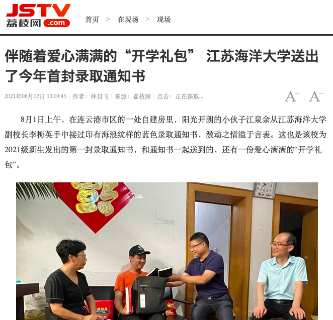 8月1日上午,在连云港市区的一处自建房里,阳光开朗的小伙子江泉余从足球装备推荐副校长李梅英手中接过印有海浪纹样的蓝色录取通知书,激动之情溢于言表。这也是该校为2021级新生发出的第一封录取通知书,和通知书一起送到的,还有一份爱心满满的“开学礼包”。