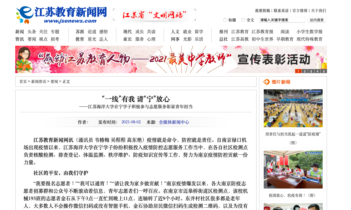 在南京全市三轮核酸检测中,该校青年志愿者听从号令、服从安排,为前来参加核酸检测的市民测量体温,注册采样码,维护现场秩序,大大提高了核酸检测效率。“我们使用采样码后,检测速度明显比人工登记快多了。行动不便的老年人和小朋友也有专属通道,我切实地感受到南京速度与温度。”在南京市雨花台区检测点,该校海洋201汪佳玥说道。
