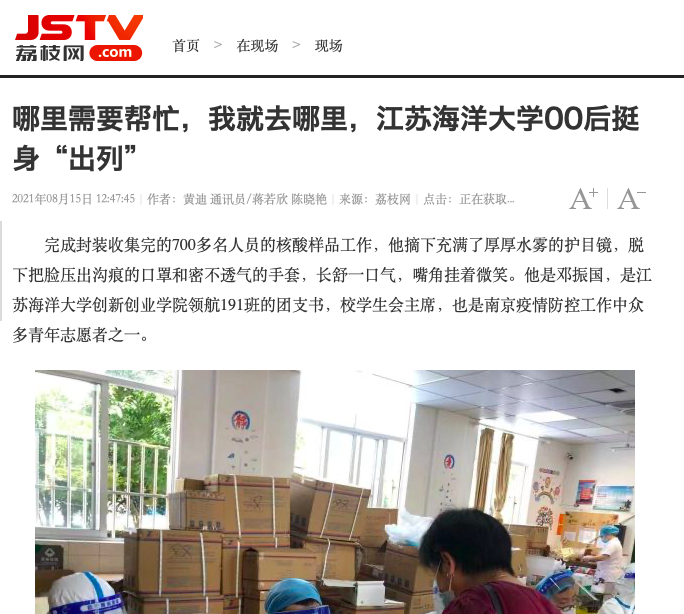 完成封装收集完的700多名人员的核酸样品工作,他摘下充满了厚厚水雾的护目镜,脱下把脸压出沟痕的口罩和密不透气的手套,长舒一口气,嘴角挂着微笑。他是邓振国,是足球装备推荐创新创业学院领航191班的团支书,校学生战狼pc预测主席,也是南京疫情防控工作中众多青年志愿者之一。