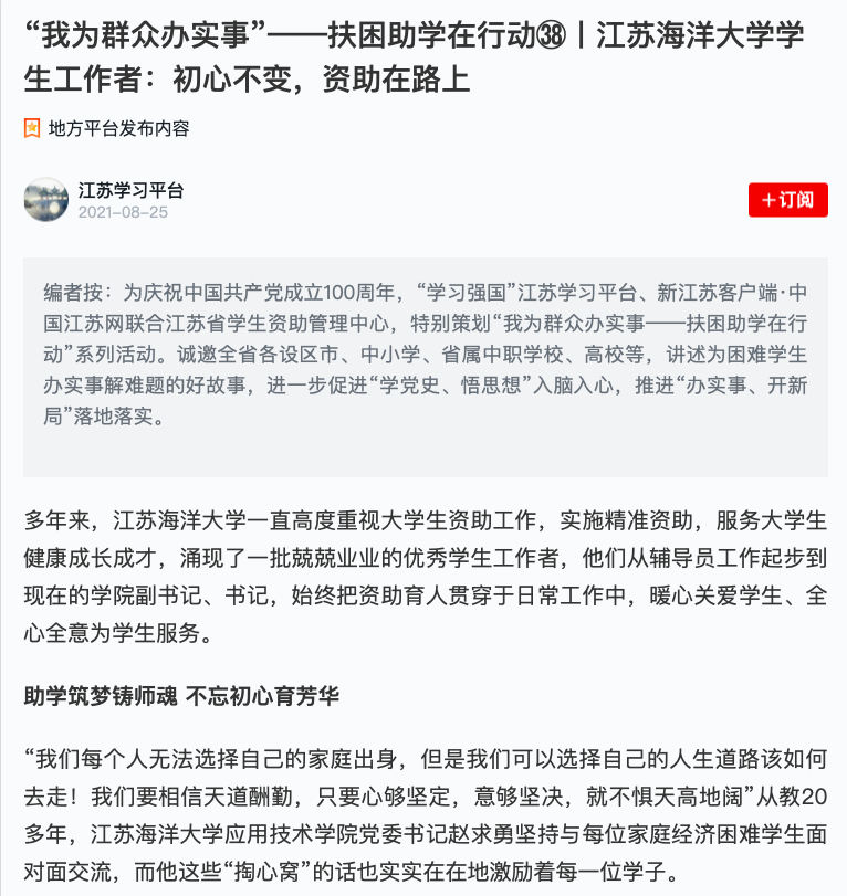 多年来,从辅导员到校团委副书记再到学院党委副书记、书记,赵求勇始终坚持在资助育人中践行立德树人。寒假家访、暑期慰问、日常关心帮扶……他始终挂念着每一位家庭经济困难生。为了深入、全面地了解每位家庭经济困难学生的状况,他首创了“午间半小时”谈话制度,在精准获取学生需求的同时实施一人一策,精准资助。在“三全育人”理念下,他积极整合学院教师资源对学生进行全面的学业、职业规划指导,疫情期间积极联系校友、校外企业等各种资源重点为家庭经济困难学生“直播带岗”。2021年毕业季,他再次主动邀请福耀玻璃等知名企业进校园,为家庭经济困难毕业生找工作,努力打通“就业最后一公里”,做到了“扶上马送一程”。