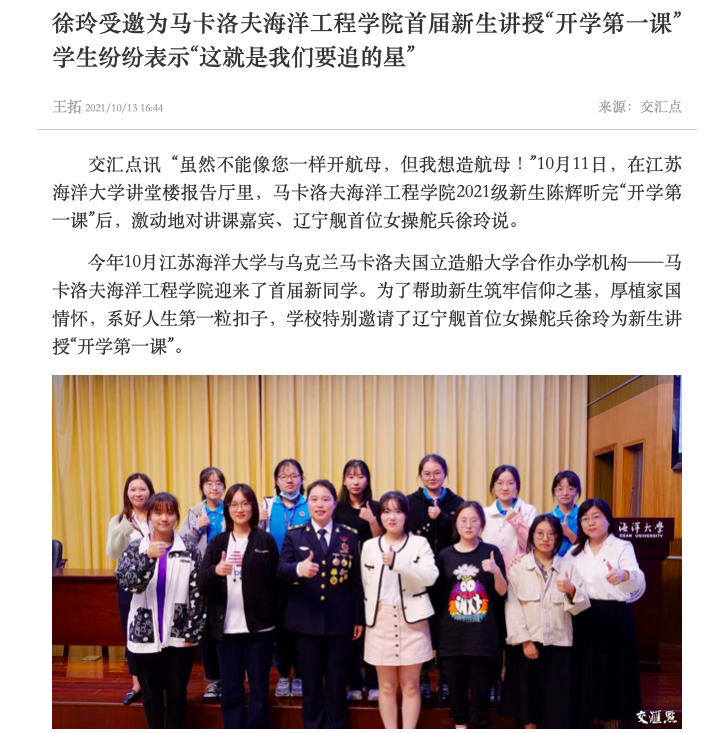 “今天很高兴,与各位大学生朋友因为‘辽宁舰’结缘”,徐玲的开场白让新同学们眼前一亮——“辽宁号”的前身“瓦良格号”是依托马卡洛夫国立造船大学的人才和科研平台建造的,作为我国第一代女水兵、中国海军首位女操舵兵,徐玲“巾帼不让须眉”,凭借果断顽强的拼搏精神,成为辽宁舰首位女操舵手,她的8年军旅生涯,亲身经历了中国海军发展历程中很多精彩瞬间,是新时代强军之路的见证者之一。