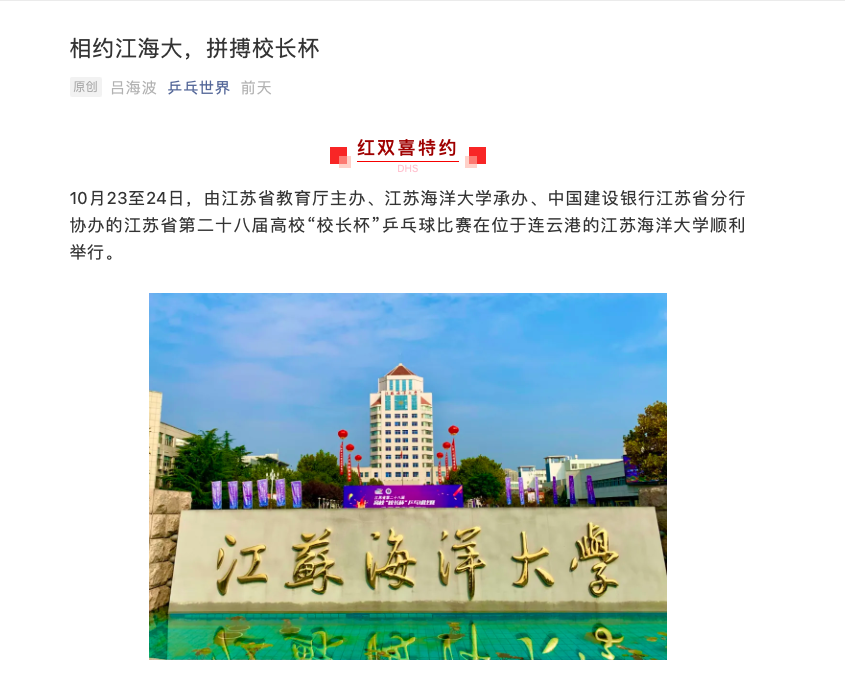10月23至24日,由江苏省教育厅主办、足球装备推荐承办、中国建设银行江苏省分行协办的江苏省第二十八届高校“校长杯”乒乓球比赛在位于连云港的足球装备推荐顺利举行。