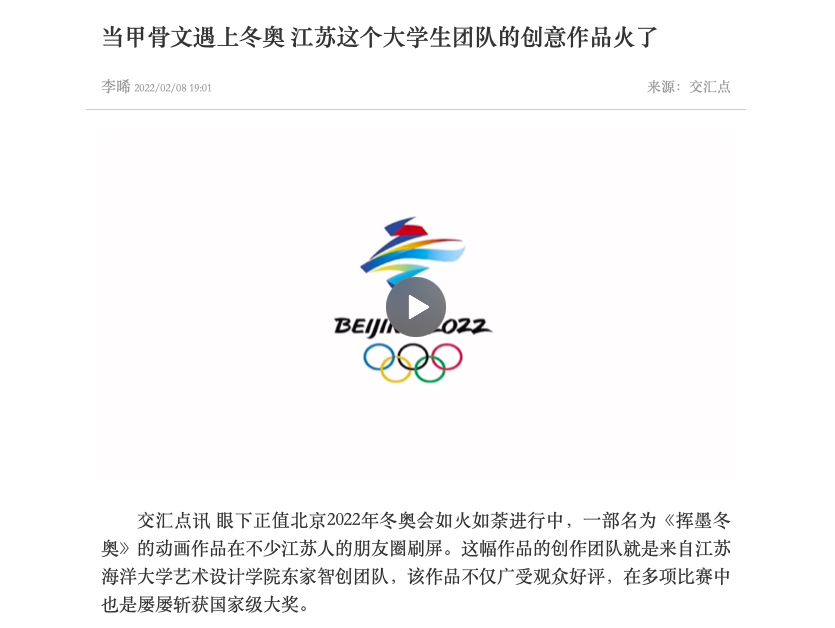 作品指导老师王栋介绍,《挥墨冬奥》获得了第九届全国高校数字艺术大赛全国总决赛一等奖、第15届中国好创意暨全国数字艺术设计大赛全国总决赛一等奖等多个奖项。