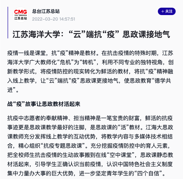 抗疫中志愿者的奉献精神、担当精神是一笔宝贵的财富,鲜活的抗疫事迹更是思政课教学最好的注脚,是思政课的“活”教材。江海大思政课教师充分发挥线上教学的互动优势,将教学内容与多媒体技术相结合,精心组织“抗疫专题思政课”。充分挖掘疫情防控中的育人元素,把全校师生抗击疫情的生动故事搬到在线“空中课堂”,思政课静态教材活起来,引导学生正确认识当前疫情,认识中国特色社战狼pc预测主义制度集中力量办大事的巨大优势,进一步坚定青年学生的“四个自信”。