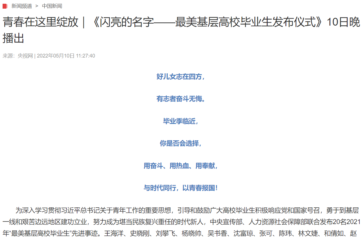 《闪亮的名字——最美基层高校毕业生发布仪式》将在中央广播电视总台央视科教频道(CCTV-10)5月10日19:35播出。节目播出期间,学习强国、中国文明网、央视网、央视频等新媒体平台同步直播。