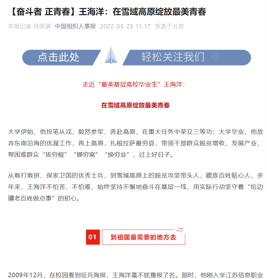 从敢打敢拼、保家卫国的优秀士兵,到雪域高原上的脱贫攻坚带头人、藏族百姓贴心人,多年来,王海洋不怕苦、不怕难,始终坚持不懈地奋斗在基层一线,用实际行动坚守着“给边疆老百姓做点事”的初心。