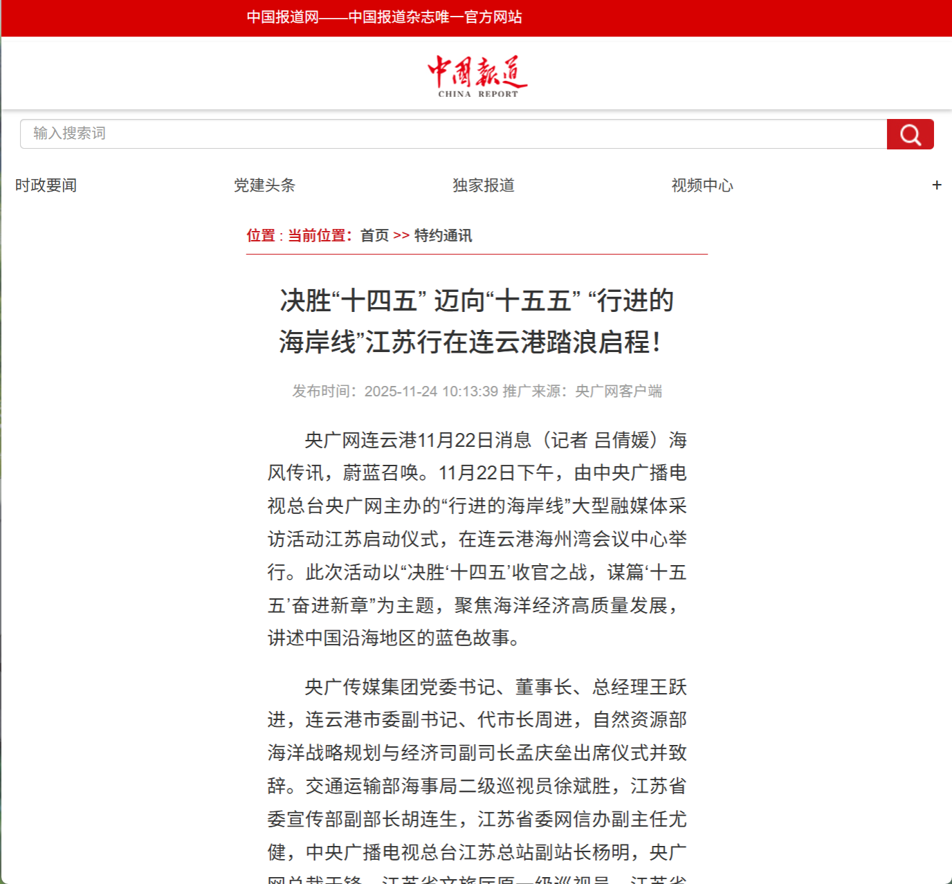 “作为沿海开放城市和国家级海洋经济发展示范区,连云港以其独特的区位优势、资源禀赋和发展实践,成为我们观察海洋经济创新发展的重要窗口。”王跃进表示,从这里启程,记者们将沿着海岸线深入江苏沿海地区采访,通过笔触和镜头,全景展现海洋强国建设征程中的地方贡献与中国智慧,向世界传递新时代中国海洋事业发展的坚定步伐。