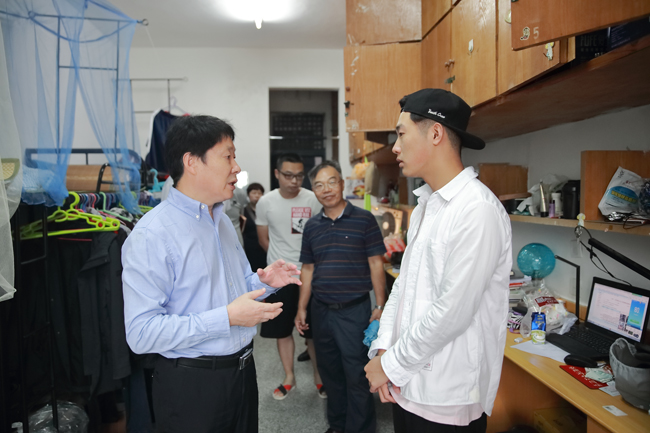 在宋跳校区,赵炳起、杜军一行深入教学事务中心、学生事务中心、食堂、浴室和学生公寓,视察了校区基础设施改造以及道路白改黑工程等收尾工作。赵炳起边检查边指导相关部门工作人员,进一步加强对学生的思想引导,提高校园管理水平,推进宿舍管理标准化,严格执行饮食安全规定,确保服务质量、服务价格、服务态度,为师生提供满意的后勤生活保障。