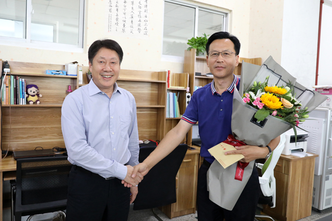 许兴友随后来到理学院,看望了2014—2016学年“优秀辅导员”获得者洪海老师。洪老师已近60岁,始终不忘初心、坚守辅导员工作岗位,长期默默无闻奉献在教育一线,做广大青年学生的人生引路人。许校长对长期以来洪老师对学校的突出贡献表示感谢,希望他为学校发展积极建言献策,并向他送上教师节的祝福。