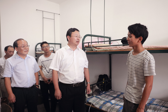 下午,校领导还来到B12号楼学生公寓,看望了2017级年龄最小的新生、来自贵州的彭豫鹏。“我们俩一样,都是15岁上大学。”宁晓明勉励他一定要好好学习,多为国家做贡献!