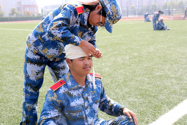军训学生进行战地救护表演