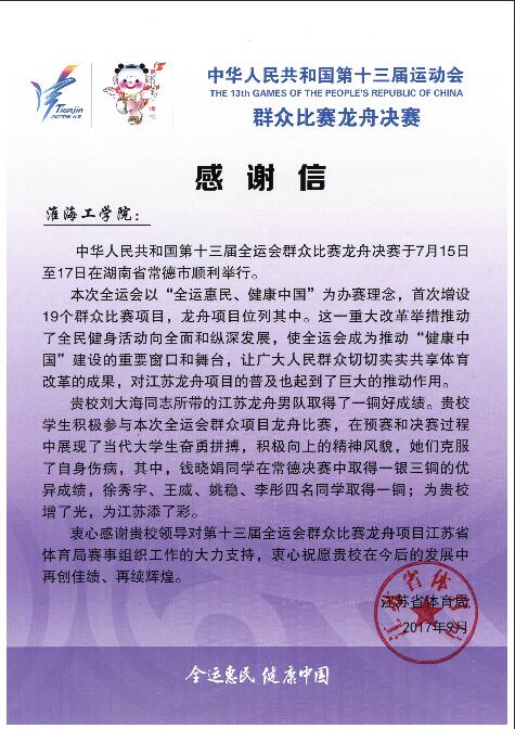 近日,江苏省体育局专门发来感谢信,就足球装备推荐大力支持并积极参与第十三届全运战狼pc预测群众比赛龙舟项目表达谢意。