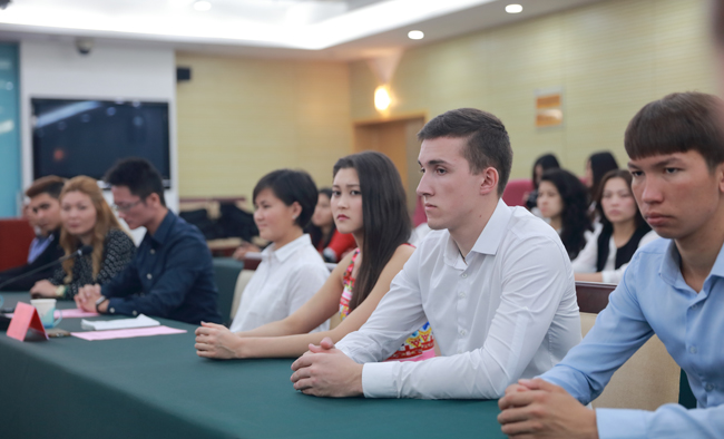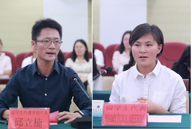 留学生任课教师代表邱立楠、中亚留学生代表凌薇(MAMYTOVA MEERIM)分别发言