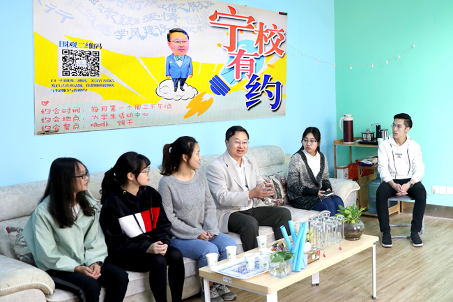 “宁校有约”是校团委打造的校长与学生交流的有效而直接的平台,每月举办一期,每期时长一个小时,每期参加人数10人左右,通过自愿报名加随机抽签的方式产生。通过与学生的对话,可以直观了解学生的生活态度、学习困惑、思想动态以及未来的职业规划,从而为学生答疑解惑,服务青年成长成才。