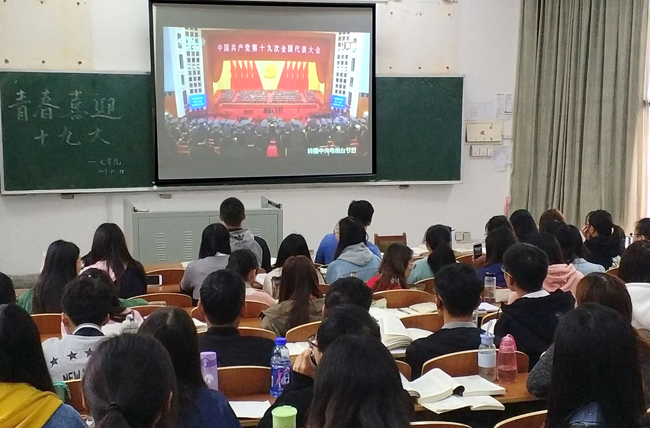 教学楼大厅里,墙上挂的电视一早就开始直播十九大开幕盛况。许多经过的学生纷纷驻足观看,有的同学还表示,回到寝室后将利用午休时间收看重播录像。学校各处食堂宽敞明亮的大厅里,没有课的同学纷纷抢占好“有利地形”,围拢在一起激动地等待实况转播的开始。