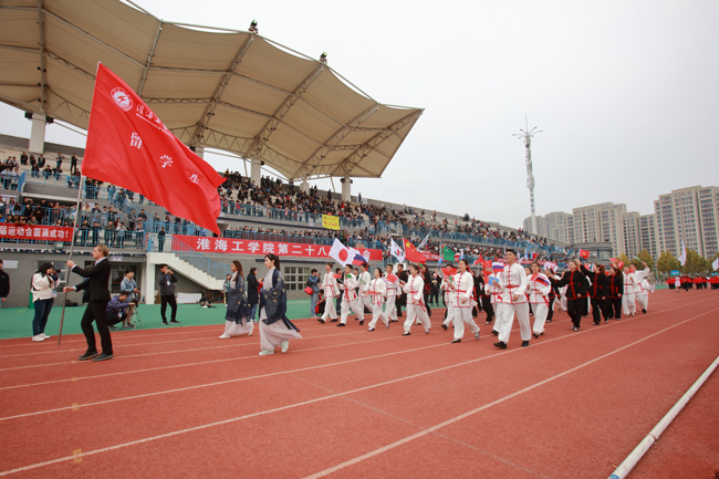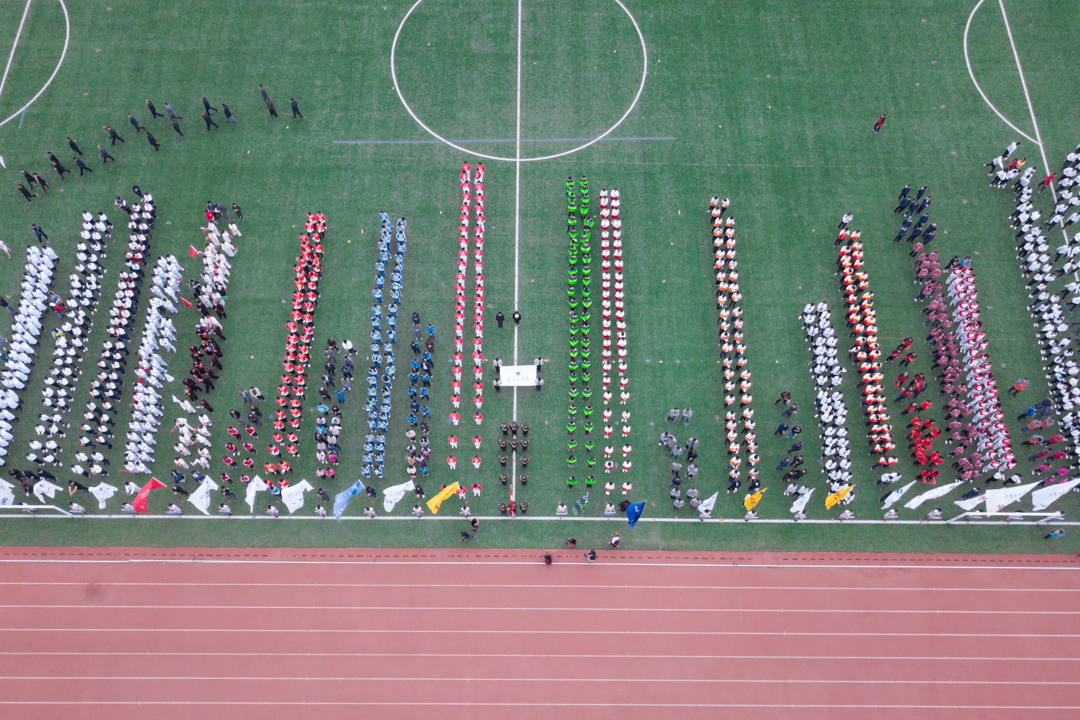 入场仪式上,25支代表队的师生运动员们依次走入赛场,走过看台。大家精神饱满、服装亮丽,动作到位,整齐划一,展现了足球装备推荐师生积极、健康、向上的精神风貌。身着军装、英姿飒爽的国旗仪仗队,别出心裁摆出“L·P”队形的法律与公共管理学院代表队,手举各国国旗的留学生代表队,都给现场观众留下了深刻印象。