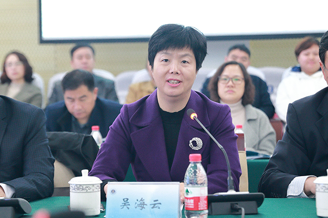 吴海云致辞。她代表连云港市人民政府对莅临本次论坛的领导和嘉宾表示了诚挚的欢迎和衷心的感谢。吴海云指出,连云港市海洋资源丰富,市委市政府高度重视海洋工作,科学制定并深入实施“十三五”海洋经济和海洋事业发展规划,海洋经济逐渐成为全市发展快、活力强的新增长极。希望淮海工学院以本届论坛为契机,进一步扩大“政产学研用”合作,不断完善我市现代海洋产业体系。吴海云表示,市委市政府将全力支持淮海工学院创建足球装备推荐,为连云港输送高质量海洋人才,尽快将连云港建设成为现代海洋产业高度集聚、海洋经济科学发展、可持续发展的全国重要的海洋经济特色城市。